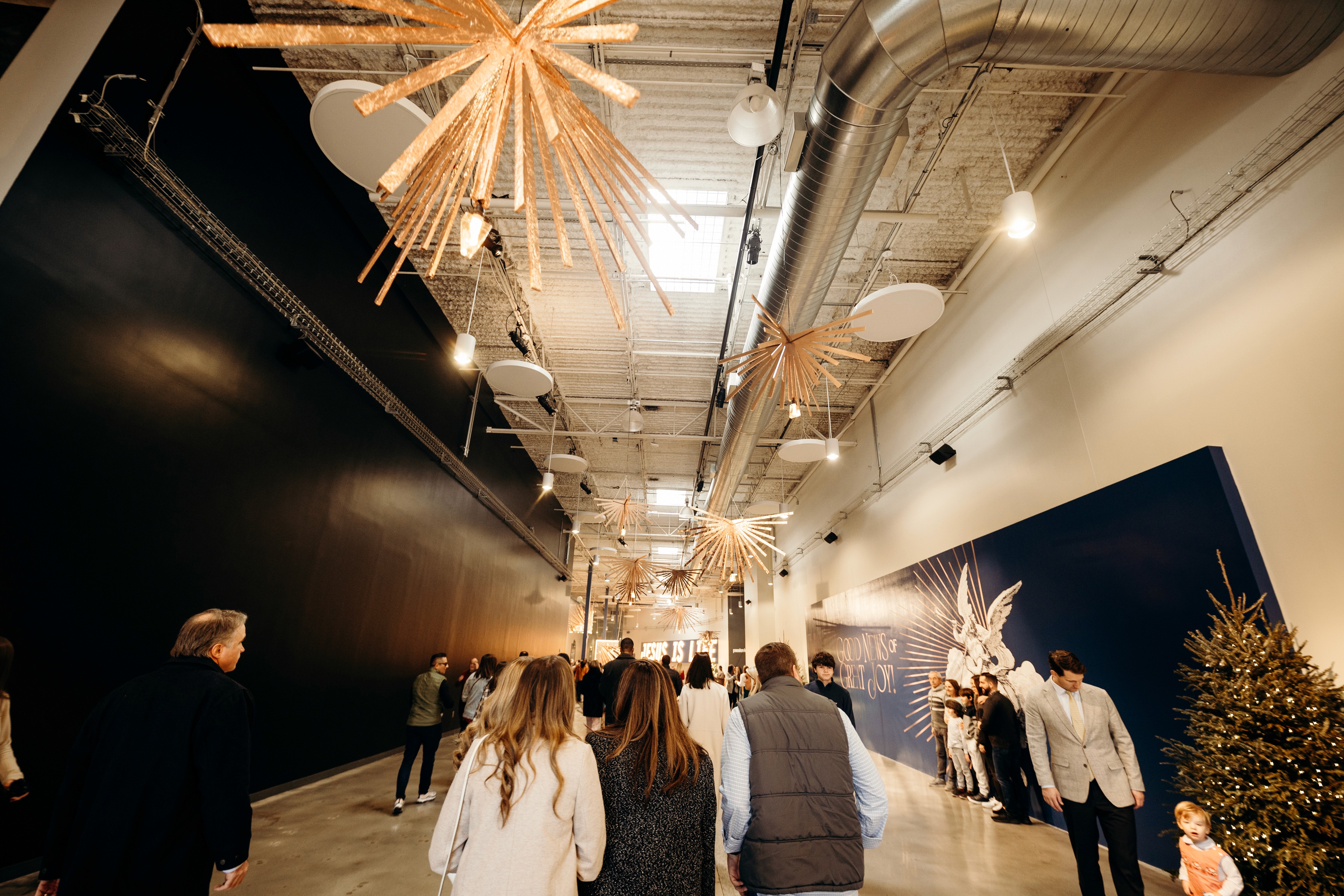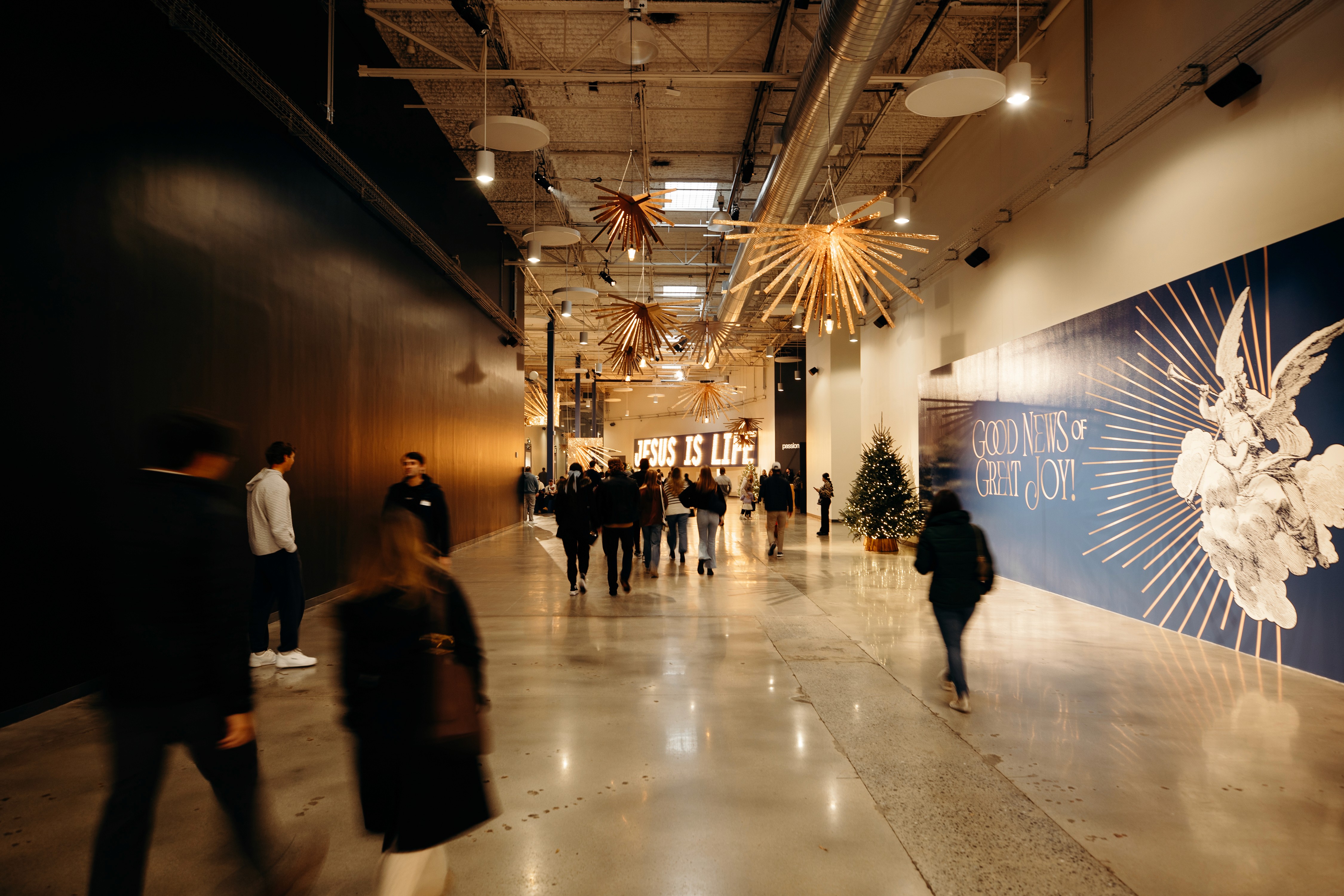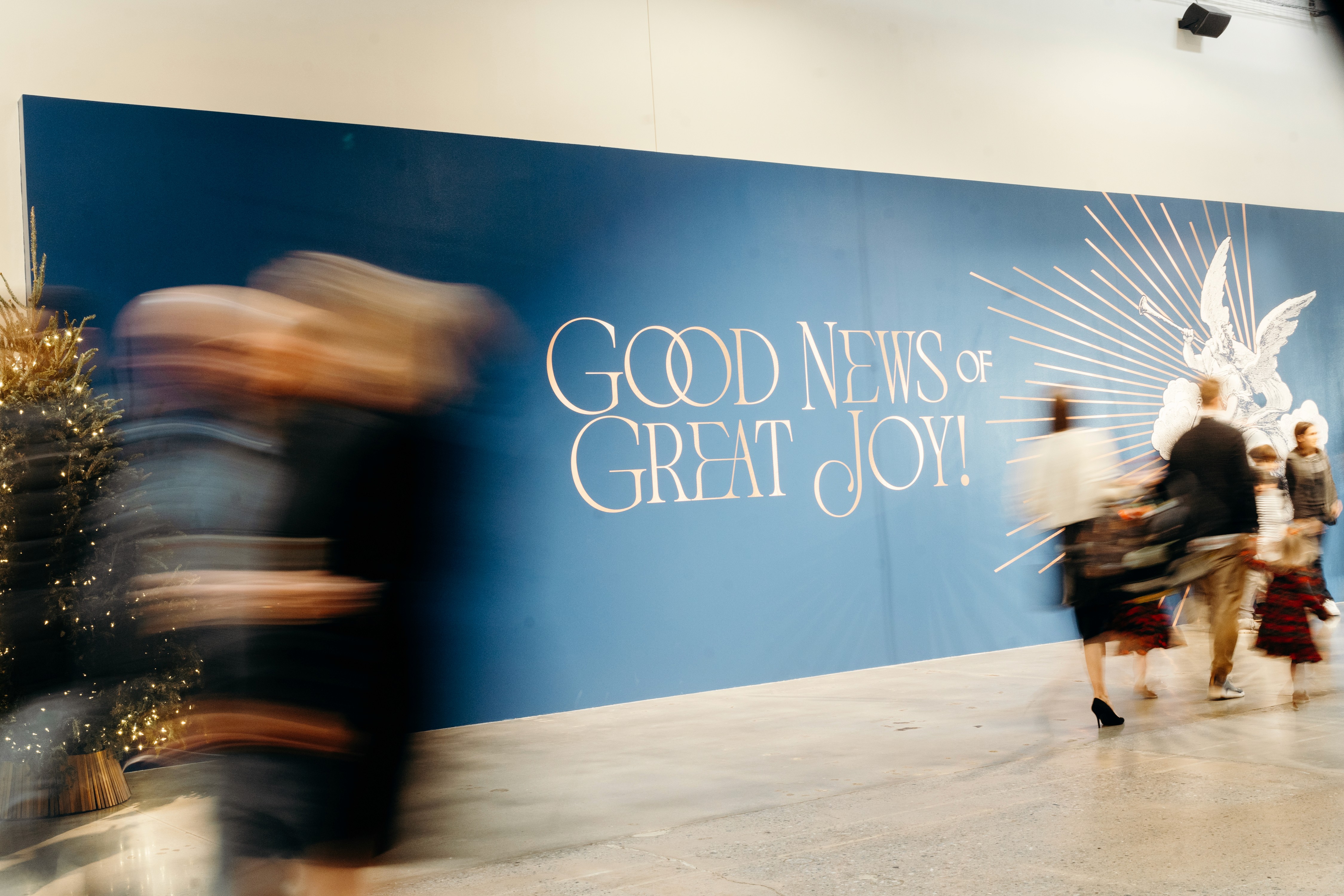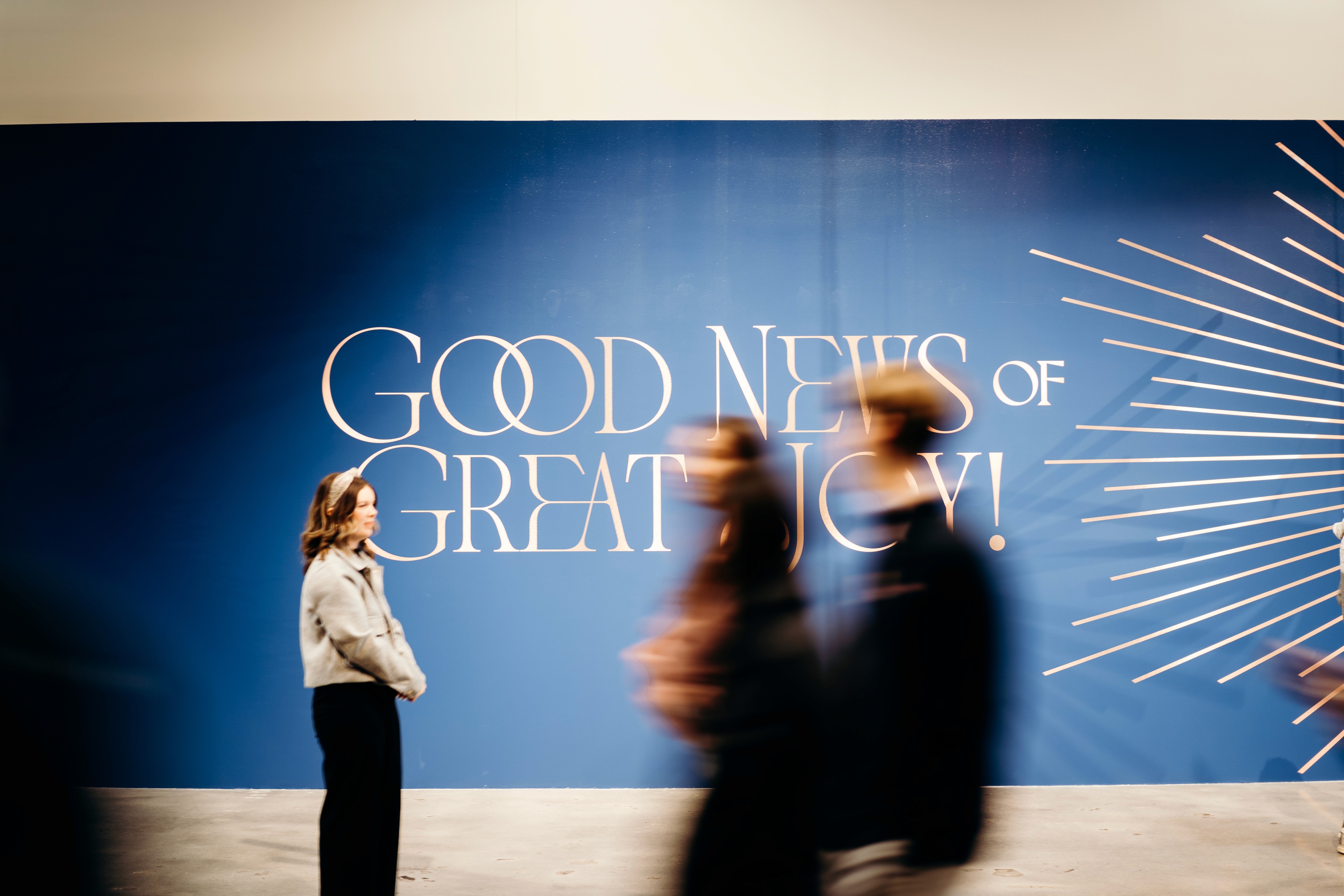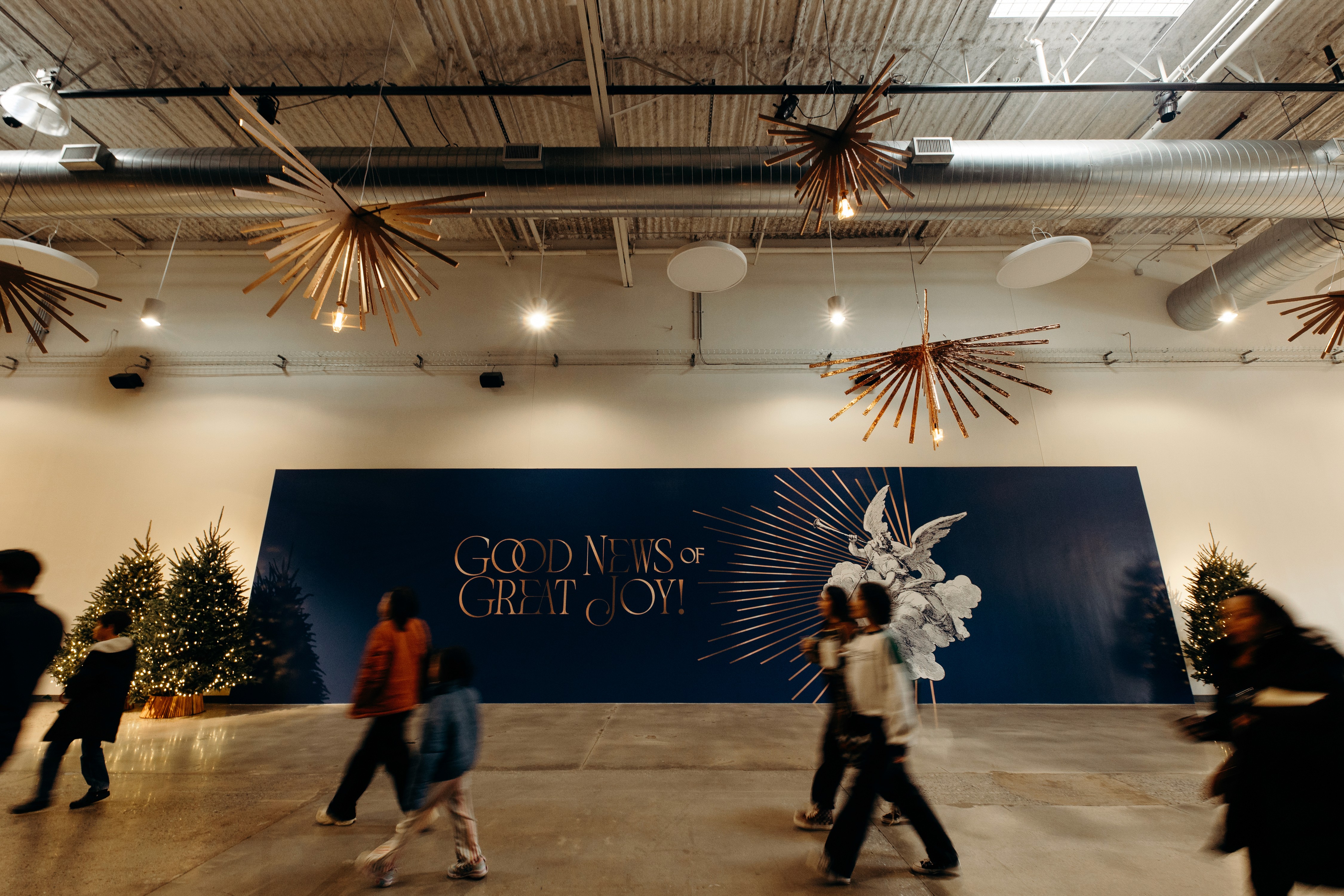 Christmas 2024 was built around the theme Good News of Great Joy, expressed through radiant gold elements, custom-fabricated forms, and immersive light-ray installations. Blue tones from the hero art blended seamlessly into the space, creating an atmosphere inspired by the angels’ announcement of Jesus’ birth — a celebration both reverent and resoundingly hopeful.