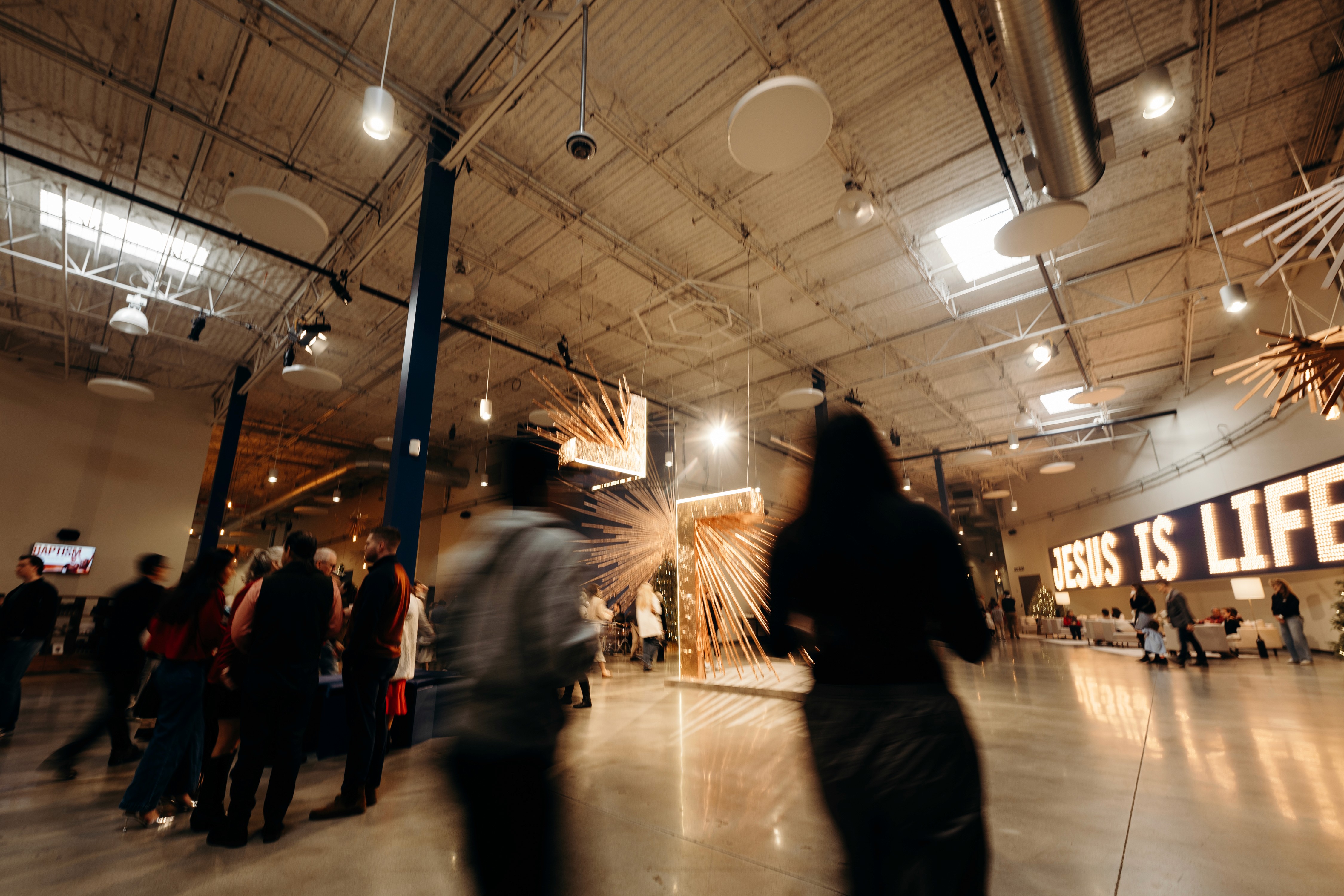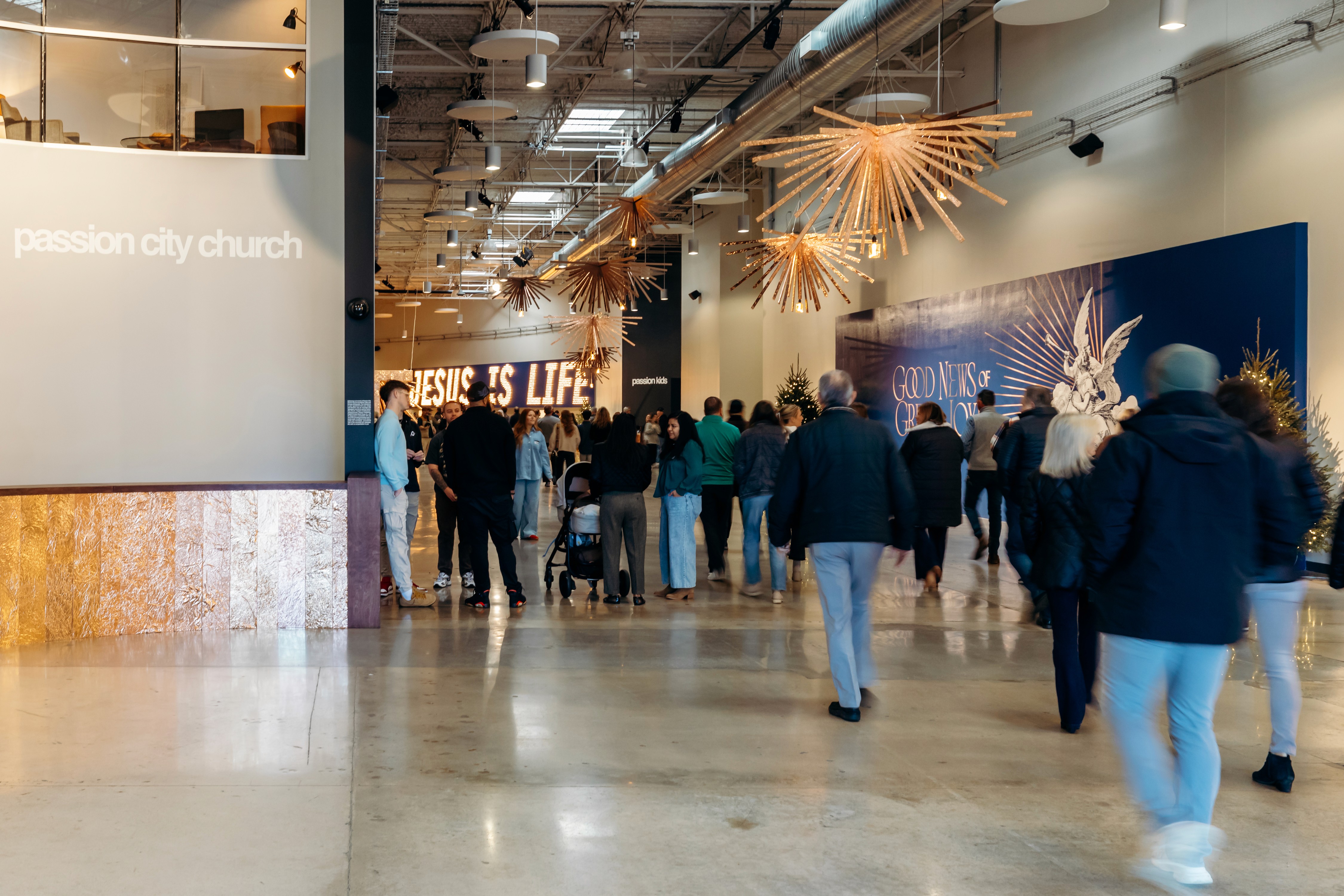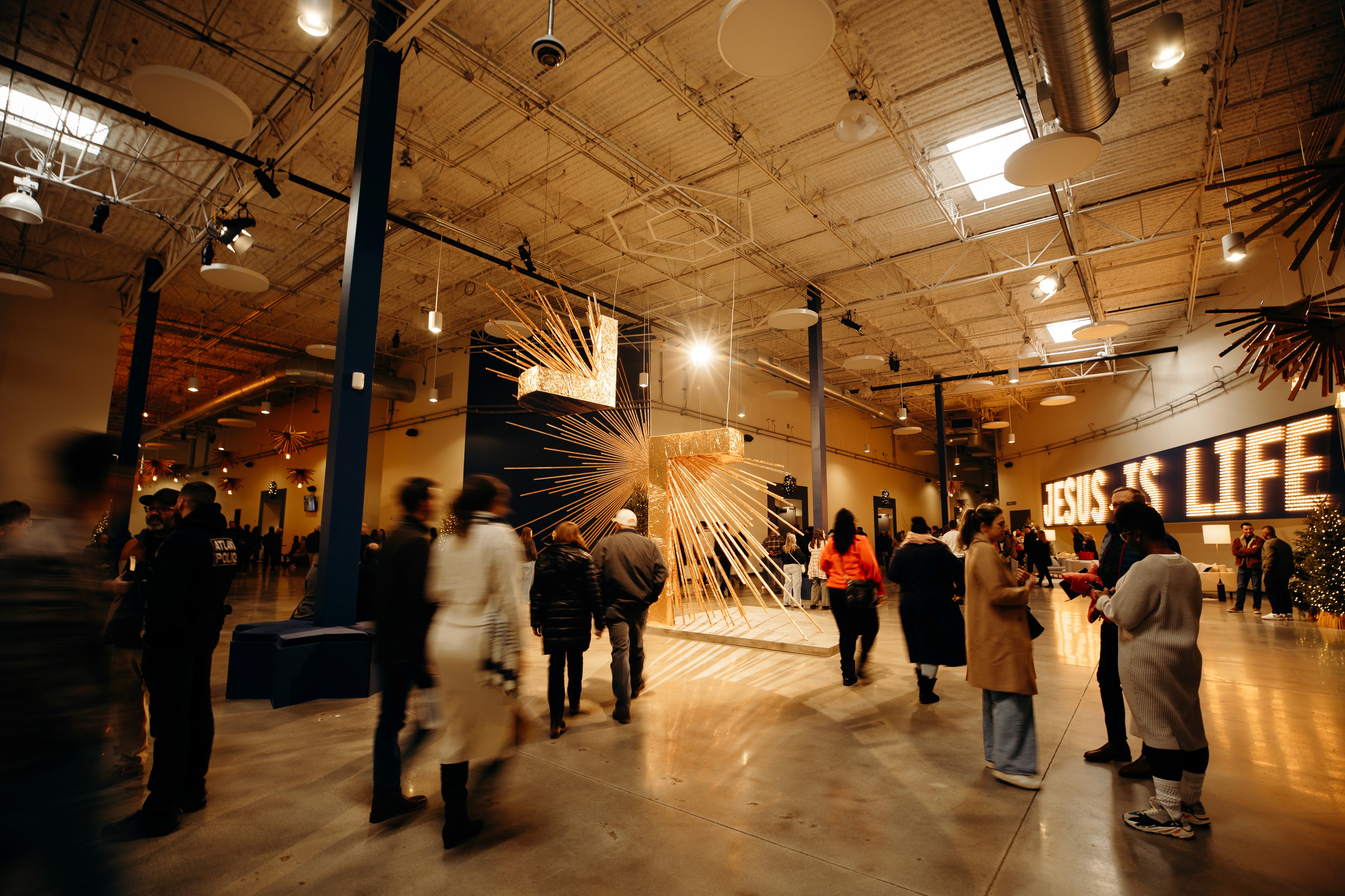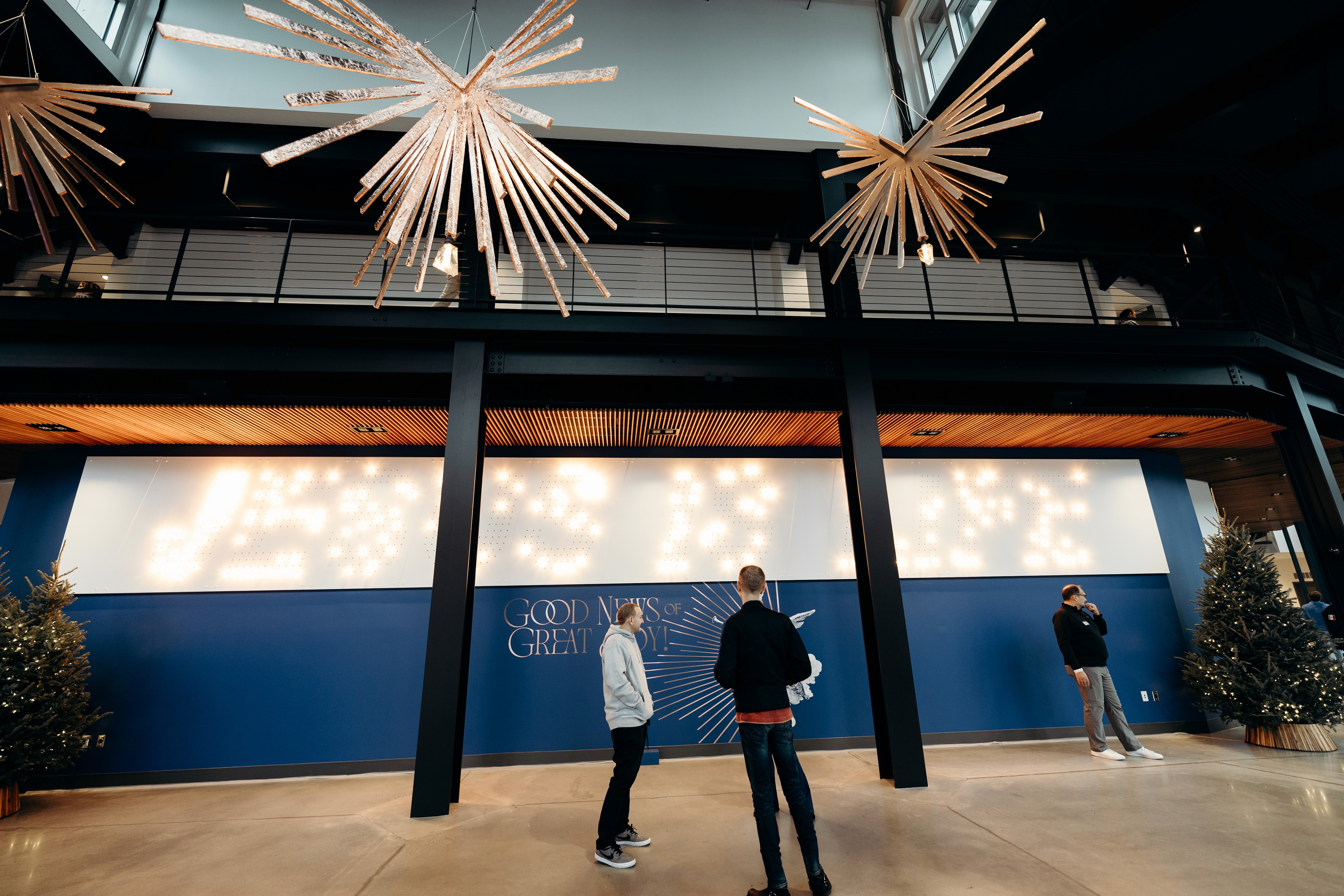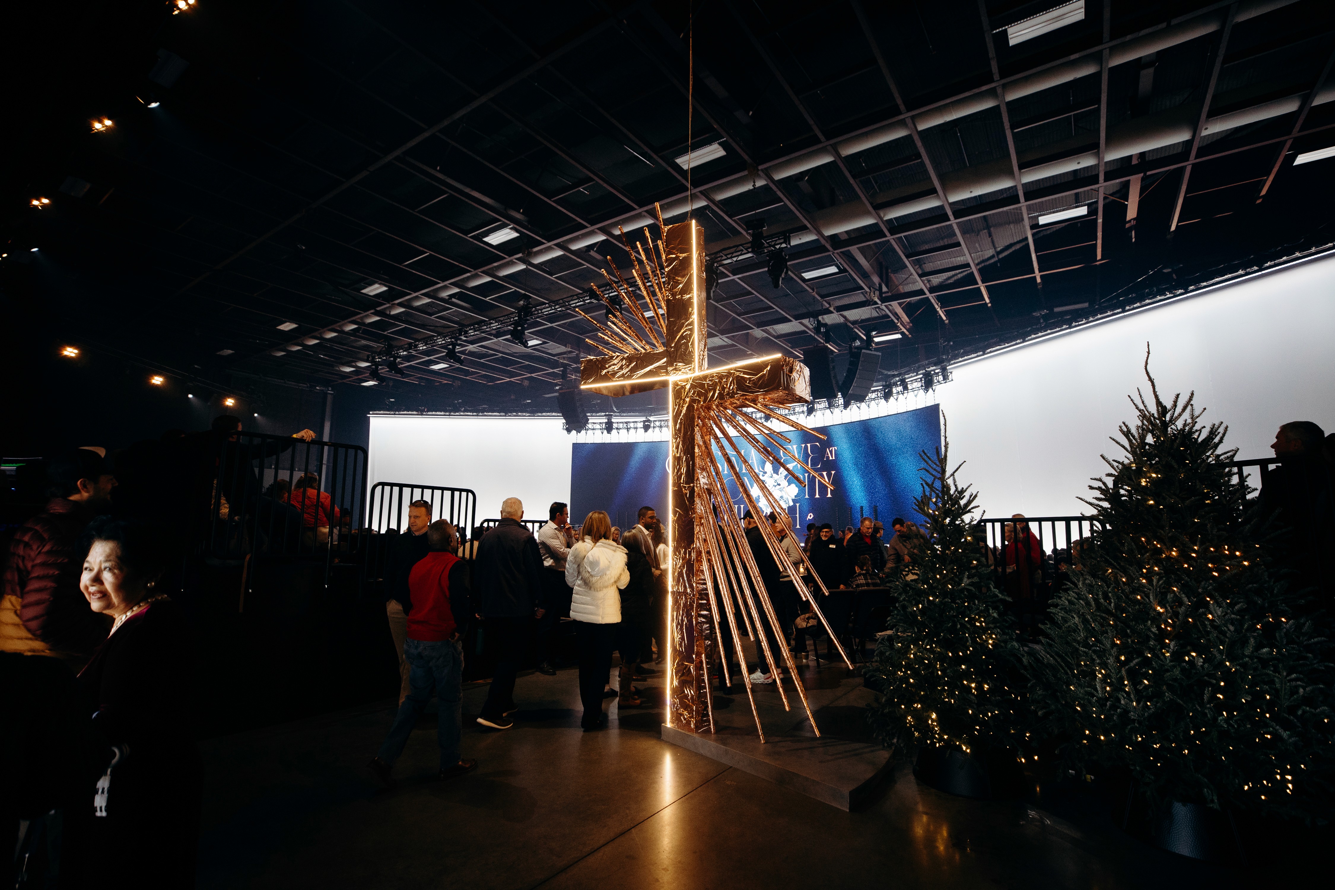 Christmas 2024 was built around the theme Good News of Great Joy, expressed through radiant gold elements, custom-fabricated forms, and immersive light-ray installations. Blue tones from the hero art blended seamlessly into the space, creating an atmosphere inspired by the angels’ announcement of Jesus’ birth — a celebration both reverent and resoundingly hopeful.