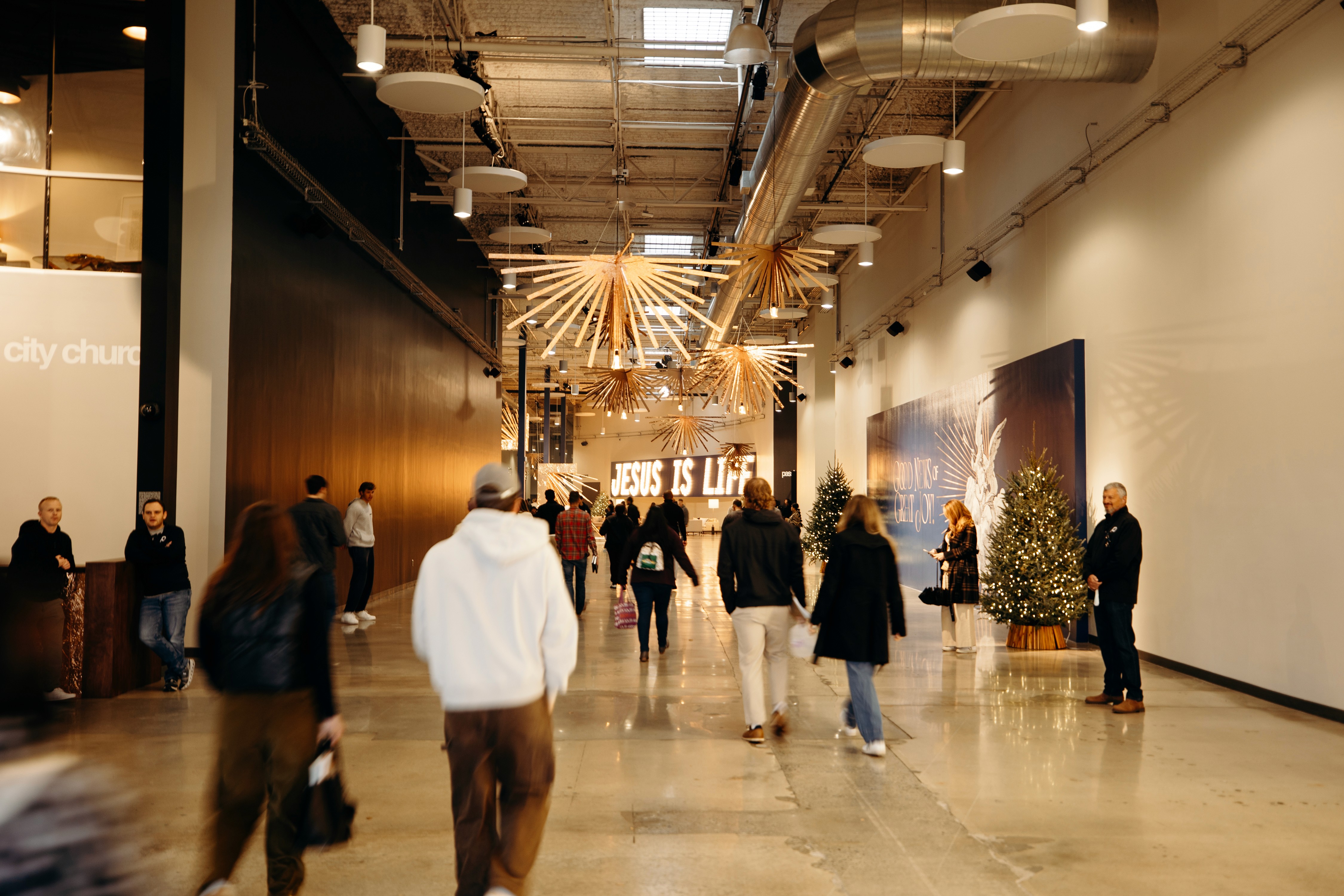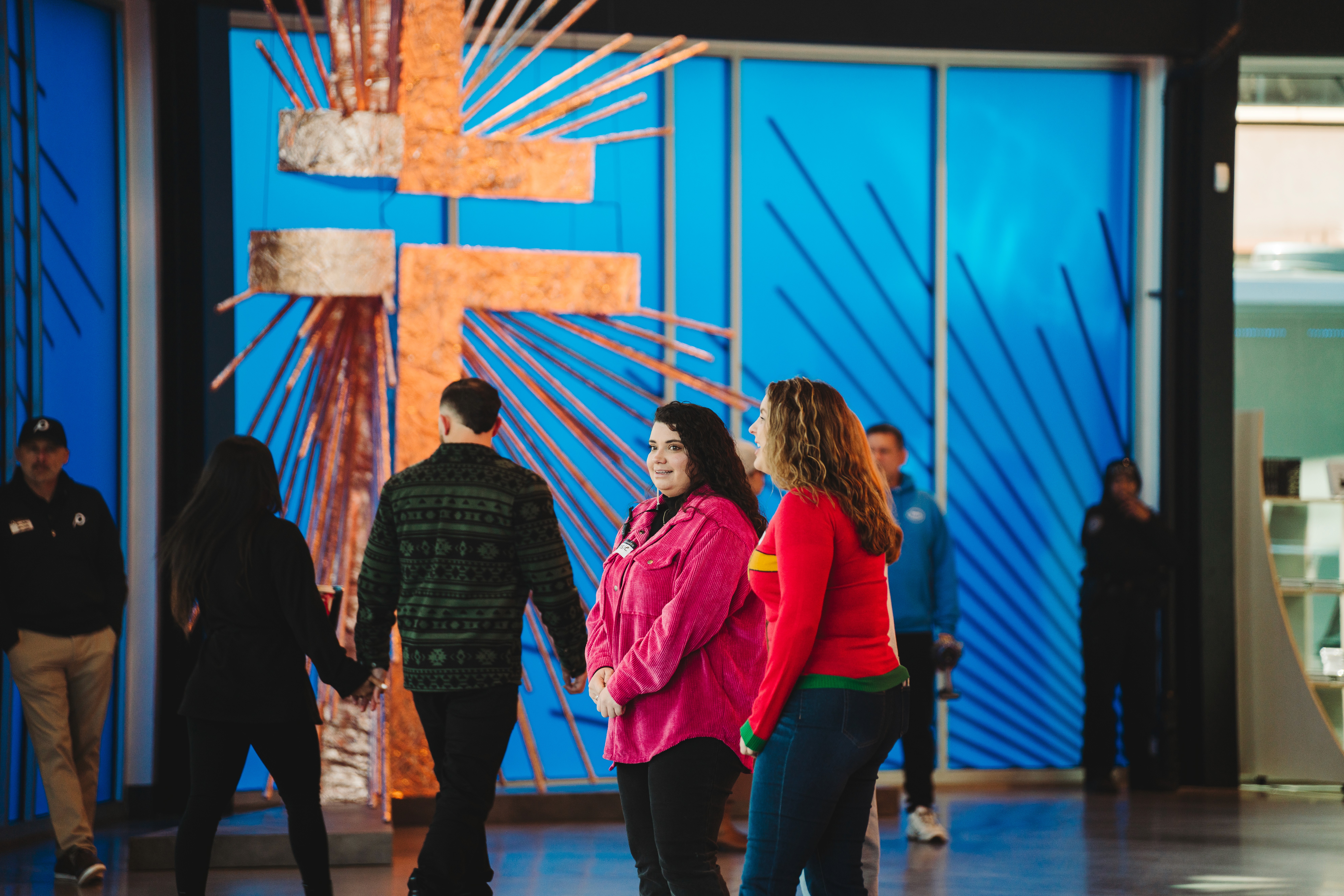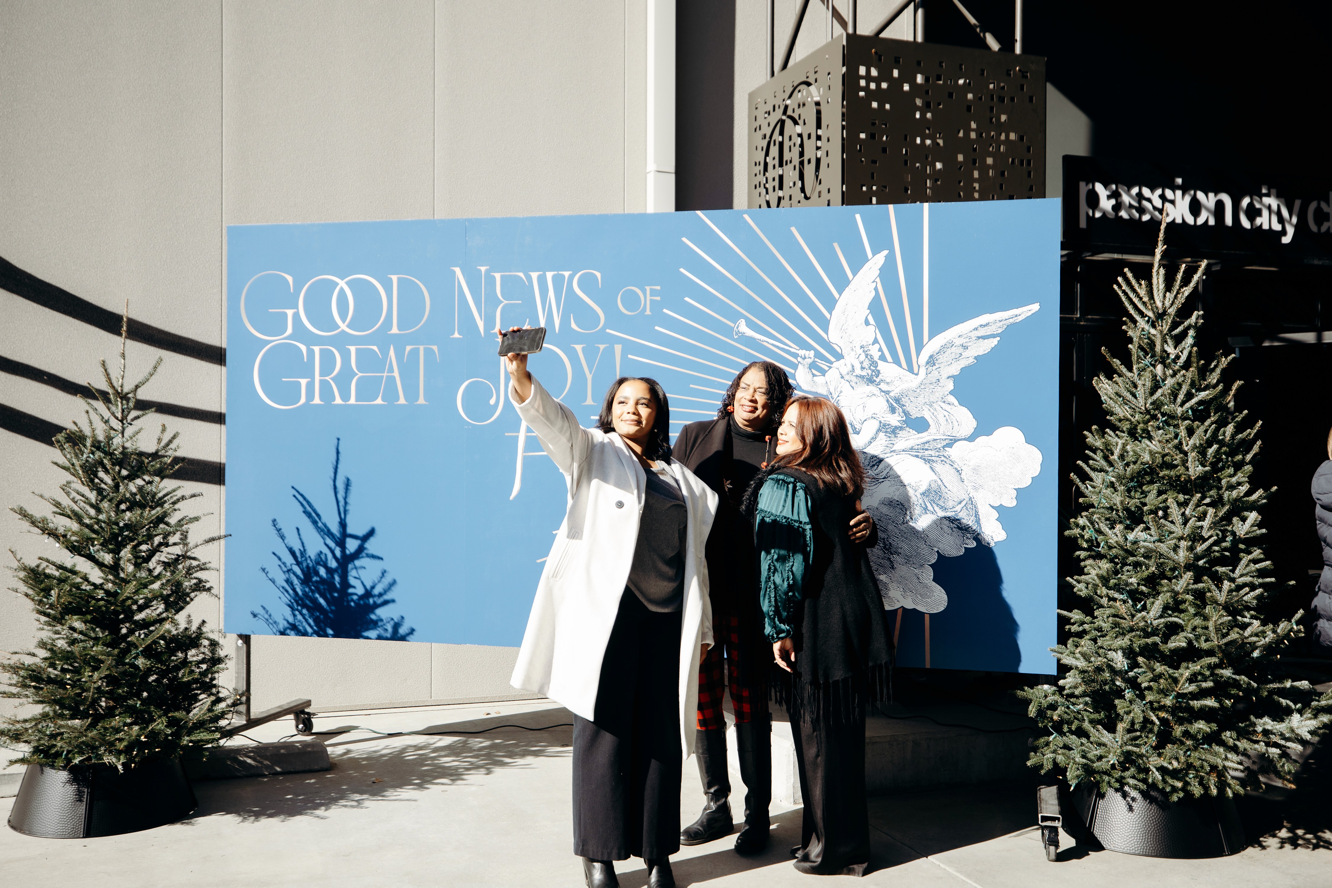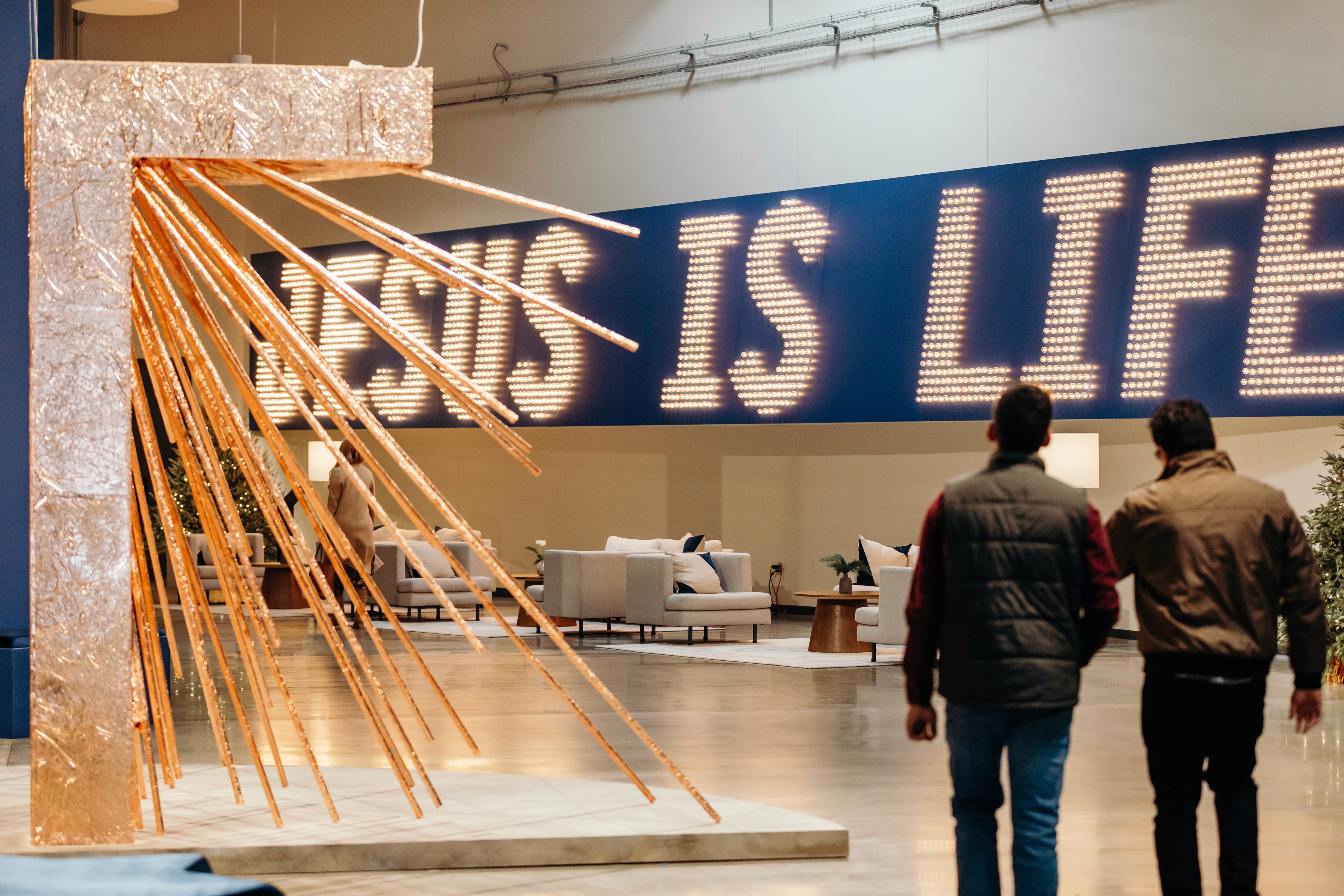 Christmas 2024 was built around the theme Good News of Great Joy, expressed through radiant gold elements, custom-fabricated forms, and immersive light-ray installations. Blue tones from the hero art blended seamlessly into the space, creating an atmosphere inspired by the angels’ announcement of Jesus’ birth — a celebration both reverent and resoundingly hopeful.